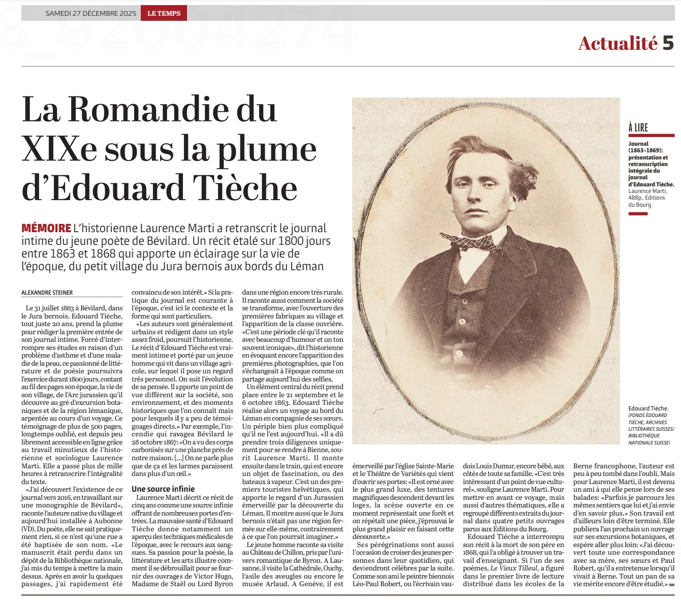 Les livres de Laurence Marti consacrés au journal d’Édouard Tièche sont disponibles à l’administration communale de Valbirse et à la Librairie du Pierre-Pertuis à Tavannes. Ils peuvent aussi être commandés sur la page Boutique.